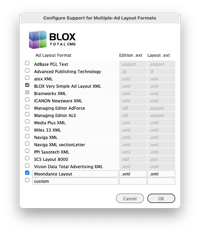 Use the Ad Layout Format: to select your primary Ad Layout Format. This menu provides access to 11 predefined Edition and Layout parsers. It also provides access to a custom option that can be used for new, yet to be added, systems or outdated systems like Managing Editors'/Cognitive's Ad Force.Â