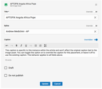 Editors can now customize an inline asset's title, byline, and caption/description at the article level without affecting the original asset metadata, enabling context-appropriate presentation of the same asset across different stories. This removes the need to duplicate assets for the sole purpose of chaging the caption/cutline! (CMSADMIN-2081)