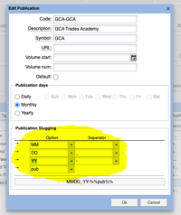 Because of the way the functionality is configured, it is easy for a site to make undesirable changes to the default for the remaining publications. You SHOULD plan on verifying that all non-special publications have the Slugging convention that you want them to have. Do that by clicking on each publication code and using the `Edit` button as described in steps 3-6 above.