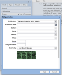 This shows a Geometry item selected for an asset in the `Publications` accordion. By selecting an Design Element Snippet in that dialog in the browser interface a selected frame on the page will become the top-left anchor for the snippet when the asset is placed. Thus, staff can pre-select the design / layout of an article asset and its children in advance of building the page.