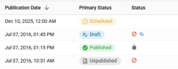 The Status column now displays dual indicators: a primary status tag (Published, Draft, Scheduled, Processing, Unpublished) and contextual icons for edit locks, publishing disabled, placed on page, workflow blocks, and unpublished changes. (CMSADMIN-215) 📷