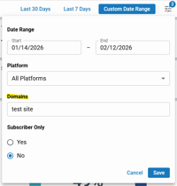 Dashboards now support filtering by domain, allowing you to view analytics across multiple domains you have access to. The default is your current domain, with the ability to expand to additional sites. (CMSADMIN-2045) 📷