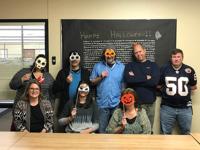 Laurie, seen here seated wearing a pumpkin mask, celebrated Halloween 2019 with the project management team.